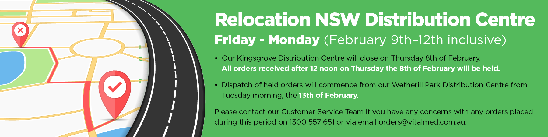 Where you have critical product requirements that need immediate action or attention during the four day transition period, we request that you contact our Customer Service Team (8:00am - 5:00pm (AEDT) Mon - Fri) on 1300 557 651, or via email orders@vitalmed.com.au, or contact your Vital Medical Key Account Manager.